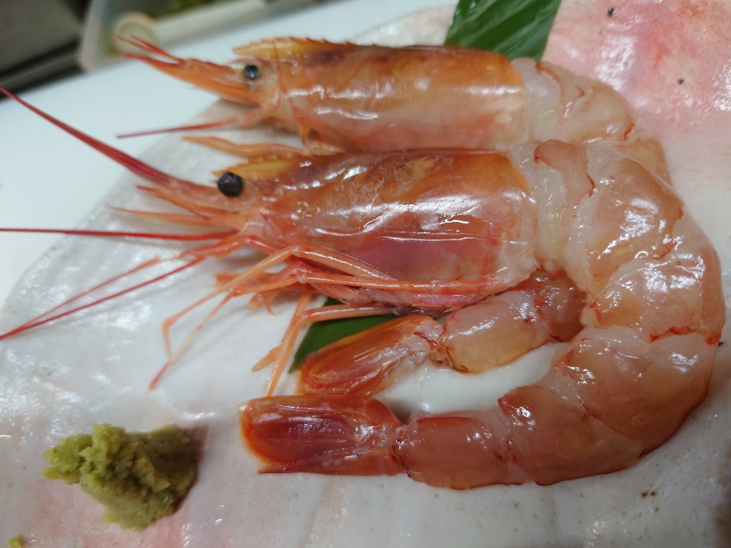店内にて公開している気まぐれメニューの「頭付きエビの刺身」です!