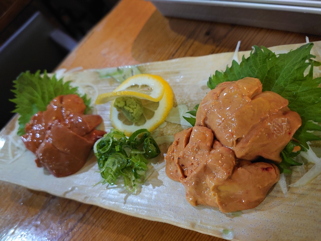 通業の鳥刺しの肝刺しとは全く違い、金色でバターの様な濃さで、わさび醤油で食べると、まるでウニのような味がします。